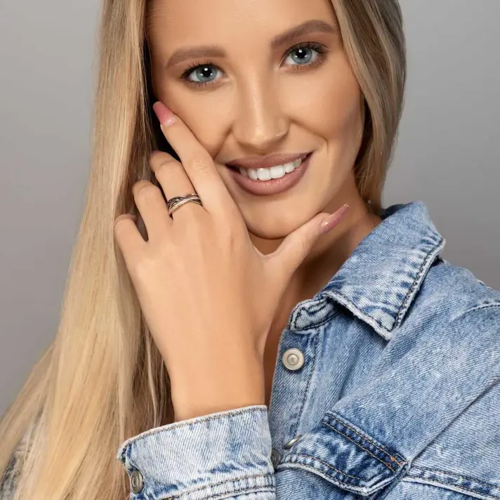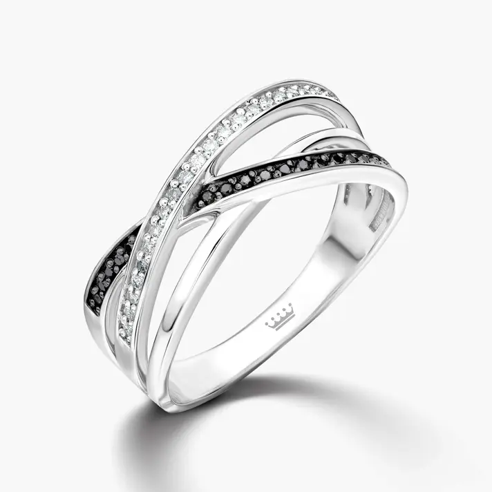 טבעת זהב 14K מעוצבת בזרועות זהב המשובצות 45 יהלומים שחורים ולבנים החוצות זו את זו. כל היהלומים המשובצים טבעיים ונוצצים.