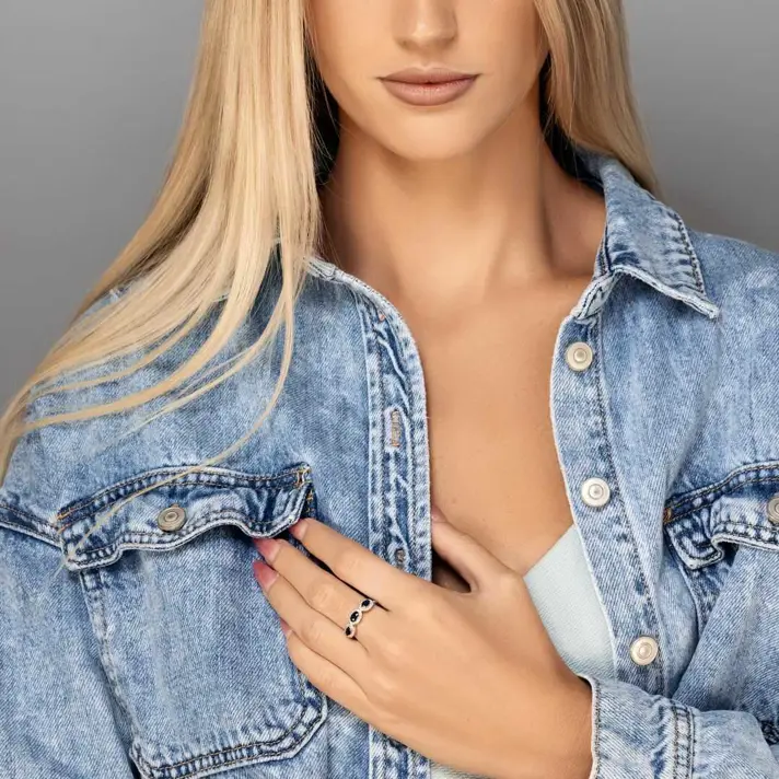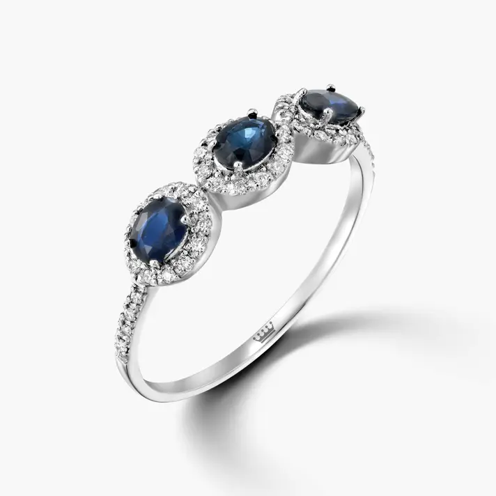 טבעת זהב 14K משובצת ב 3 אבני ספיר כחולות במשקל 0.68 קראט ובעוד 44 יהלומים טבעיים ונוצצרים במשקל 0.17 קראט. אורך ראש הטבעת 1.5 ס"מ, רוחב - 0.4 ס"מ. רוחב הטבת 1 מ"מ
