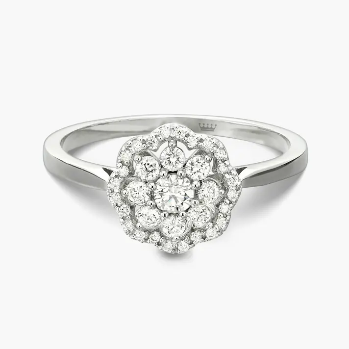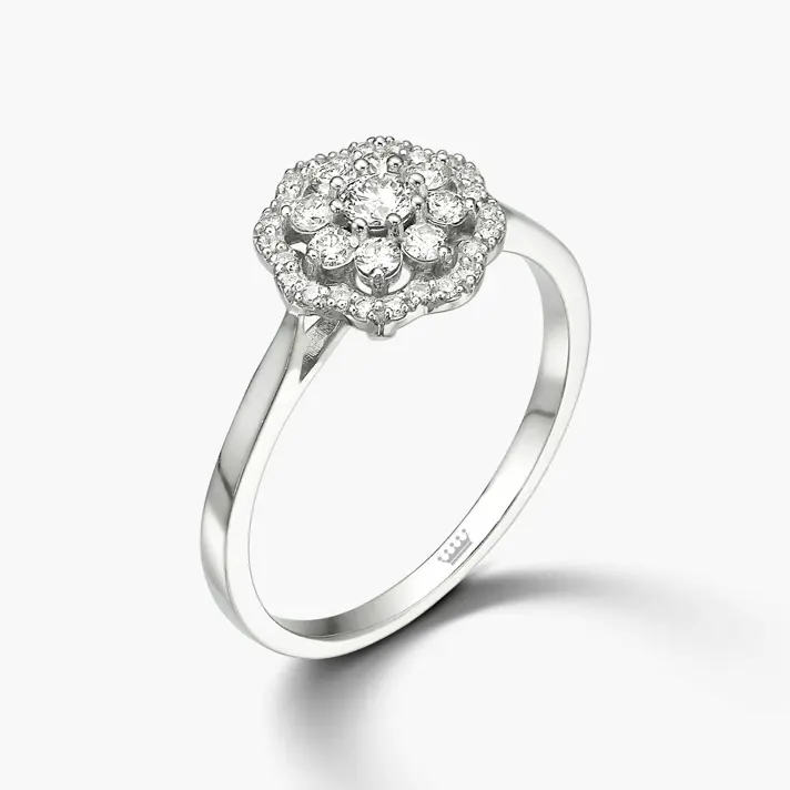 טבעת זהב 14K לבן בצורת פרח משובץ 33 יהלומים טבעיים ונוצצים. קוטר ראש הטבעת 1 ס"מ.