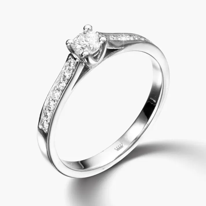 טבעת זהב לבן המשובצת יהלומים בהיקף העליון של הטבעת. במרכז הטבעת יהלום גדול ומרשים.