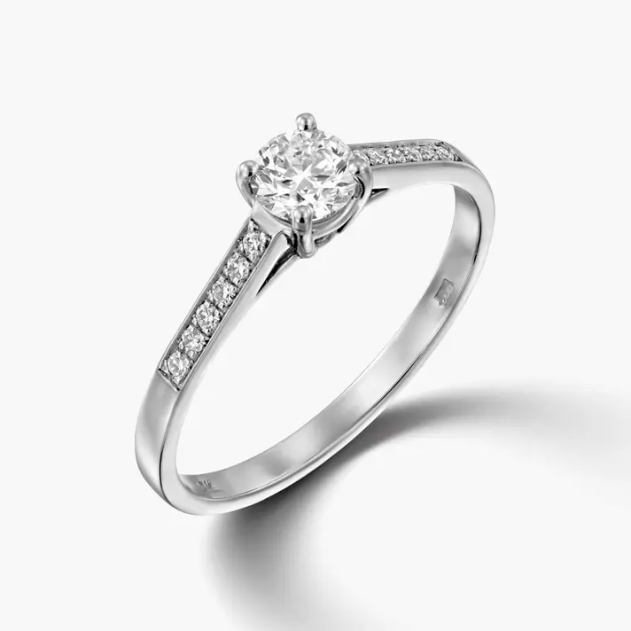 טבעת זהב 14K סוליטר המשובצת ביהלום מרכזי ומשני צדדיו 12 יהלומים נוצצים. רוחב הטבעת 1.5 מ"מ. גובה האבן המרכזית 6 מ"מ