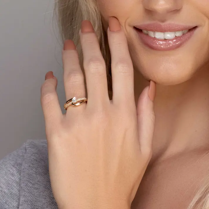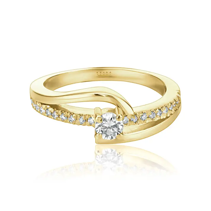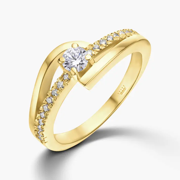 טבעת זהב 14K סוליטר המשובצת בשתי זרועות המחזיקות מבנה המשובץ באבן יהלום מרכזית. רוחב חלקה העליון של הטבעת 7 מ"מ. סה"כ משובצים בטבעת 21 יהלומים טבעיים ונוצצים.