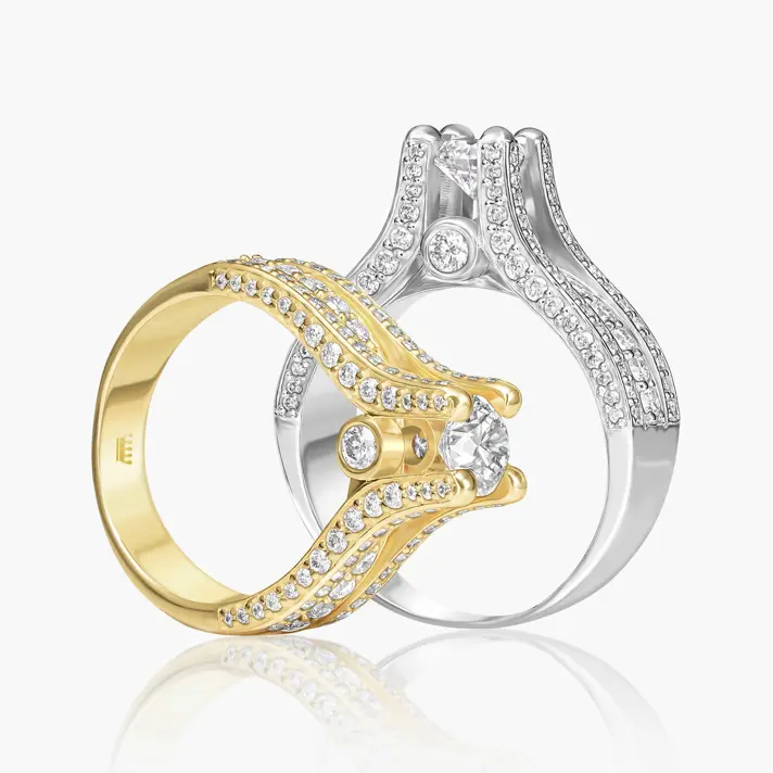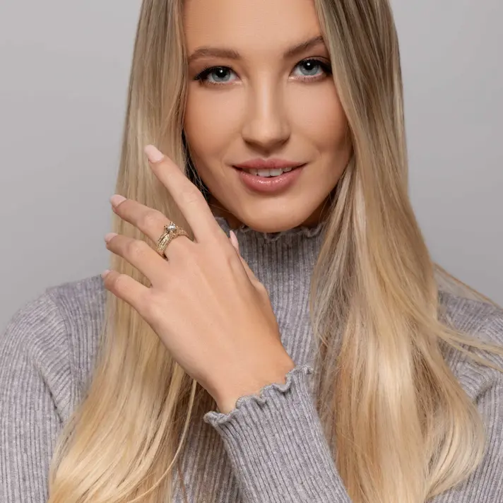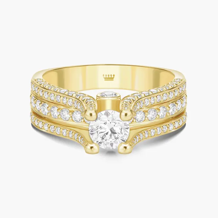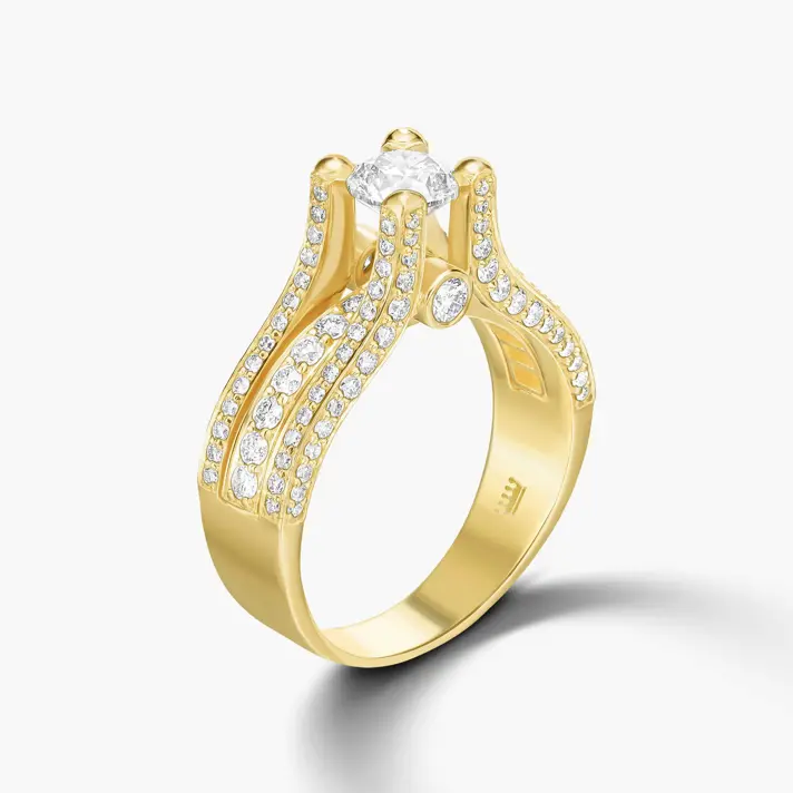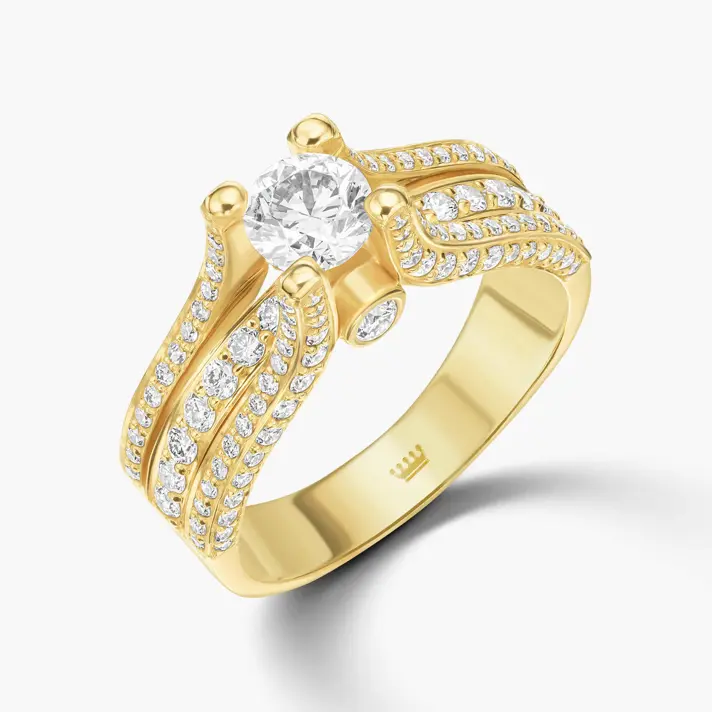 טבעת זהב 14K המשובצת יהלומים גם בחלקה העליון וגם מצדדיה. בטבעת משובצים סה"כ 131 יהלומים טבעיים ונוצצים. לפירוט נתוני היהלומים ניתן ללחוץ על נתוני האבנים.
