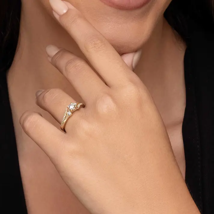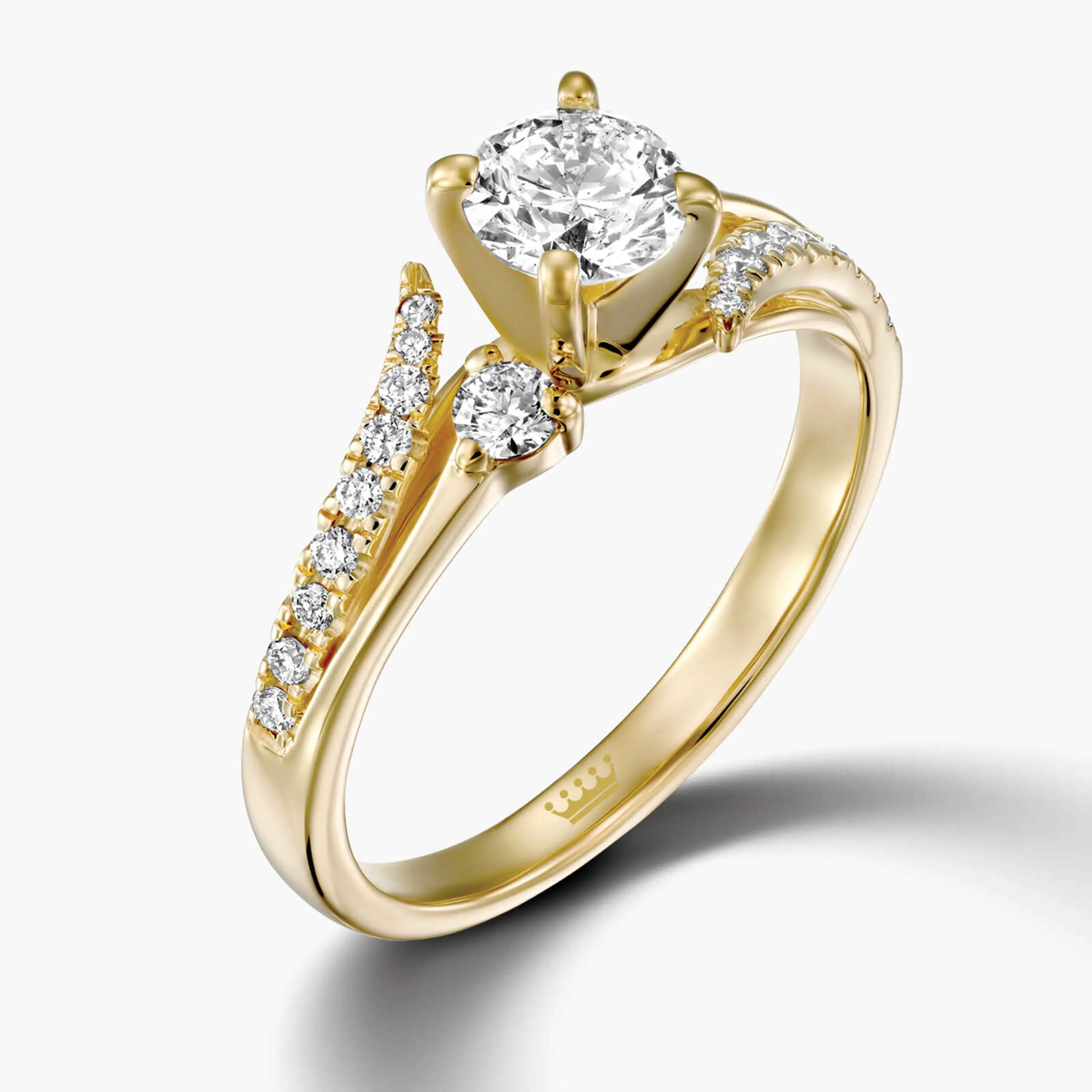 טבעת זהב 14K בסגנון סוליטר המשובצת אבן מרכזית גדולה ומשני צדדיה 2 יהלומים קטנים יותר. לטבעת שתי כנפיים היוצאות משטח עיגול הטבעת ומשובצות יהלומים. כל היהלומים המשובצים בטבעת טבעיים ונוצצים בחיתוך FULL CUT בעל 57 משטחי ליטוש המבטיחים נצנוץ מקסימלי לאורך זמן.