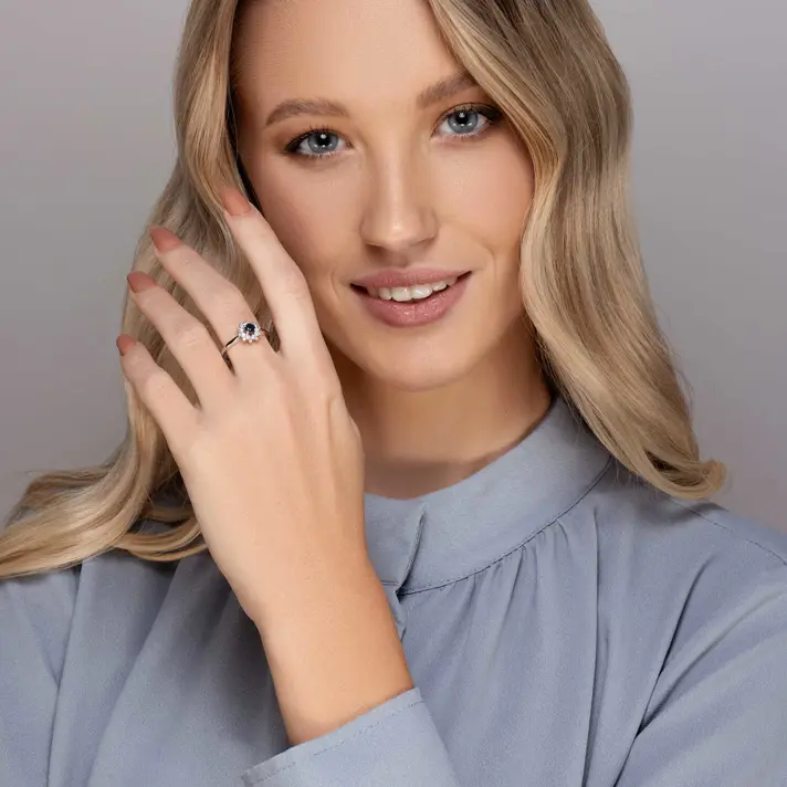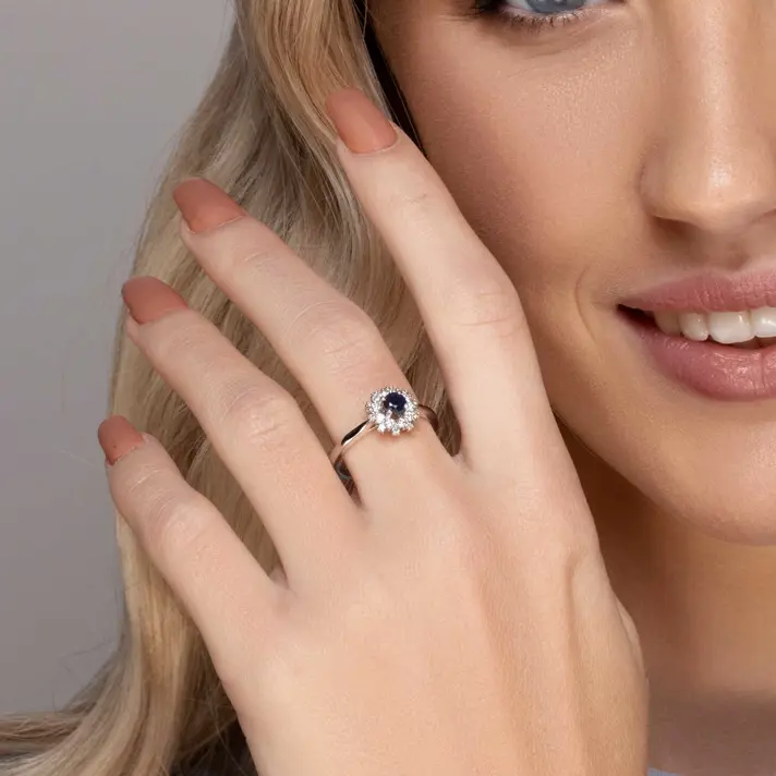 טבעת זהב משובצת פרח יהלומים ובמרכזו אבן ספיר כחולה ומלכותית. סה"כ משובצים בטבעת 20 יהלומים טבעיים ונוצצים. קוטר ראש הטבעת 9 מ"מ.