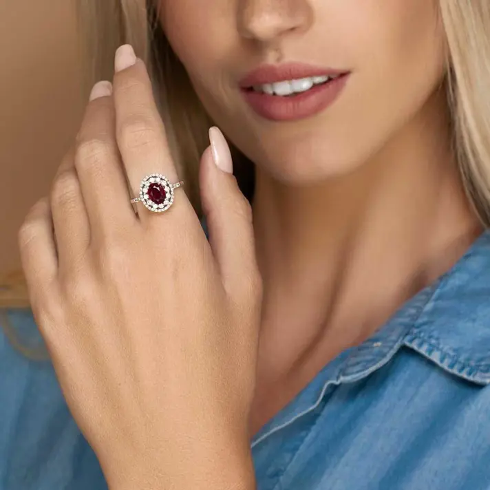 טבעת זהב 14K עם ראש אובאלי משובצת באבן רובי אדומה מוקפת בשני מעגלים של 50 יהלומים טבעיים ונוצצים. רוחב ראש הטבעת 1.2 ס"מ ואורכה 1.4 ס"מ