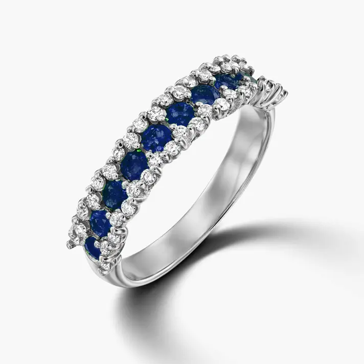 טבעת זהב 14K משובצת ב 10 אבני ספיר כחולות במשקל קראט מוקפות בשתי שורות של 38 יהלומים טבעיים ונוצצים במשקל 0.33 קראט ברמת נקיון SI ובצבע H.עובי הטבעת 0.4 ס"מ