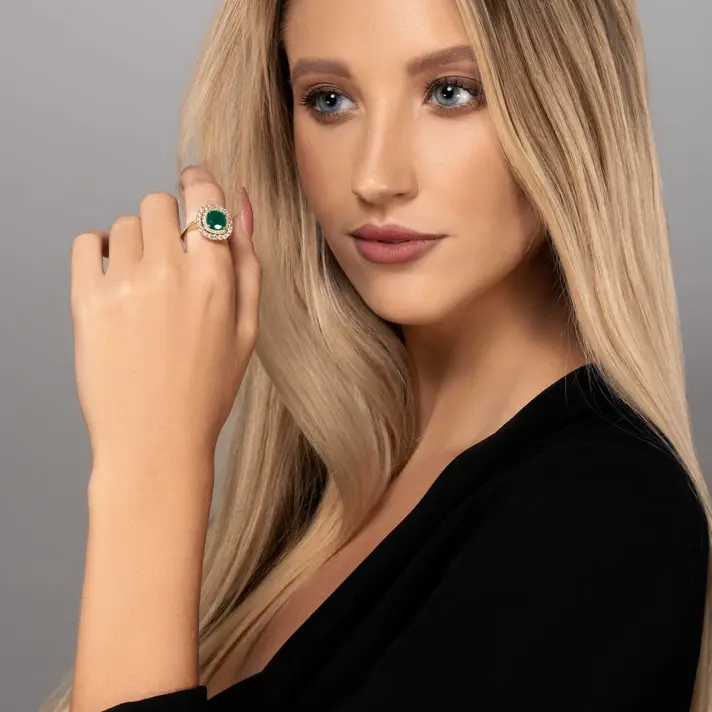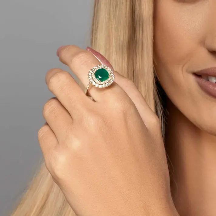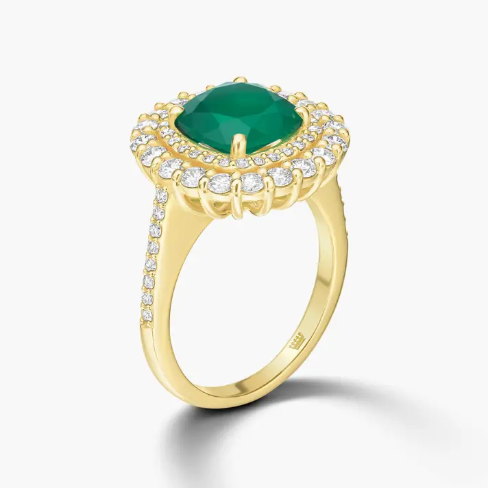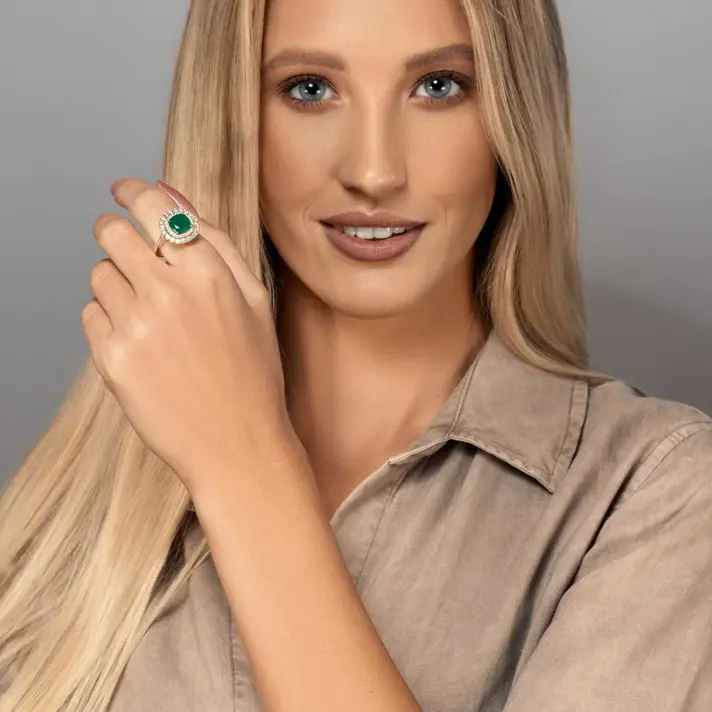טבעת זהב 14K המשובצת במרכזה באבן אגת ירוקה המוקפת 62 יהלומים טבעיים ונוצצים. לפרוט נתוני האבנים ניתן ללחוץ על נתוני אבני החן. קוטר ראש הטבעת 1.7 ס"מ.