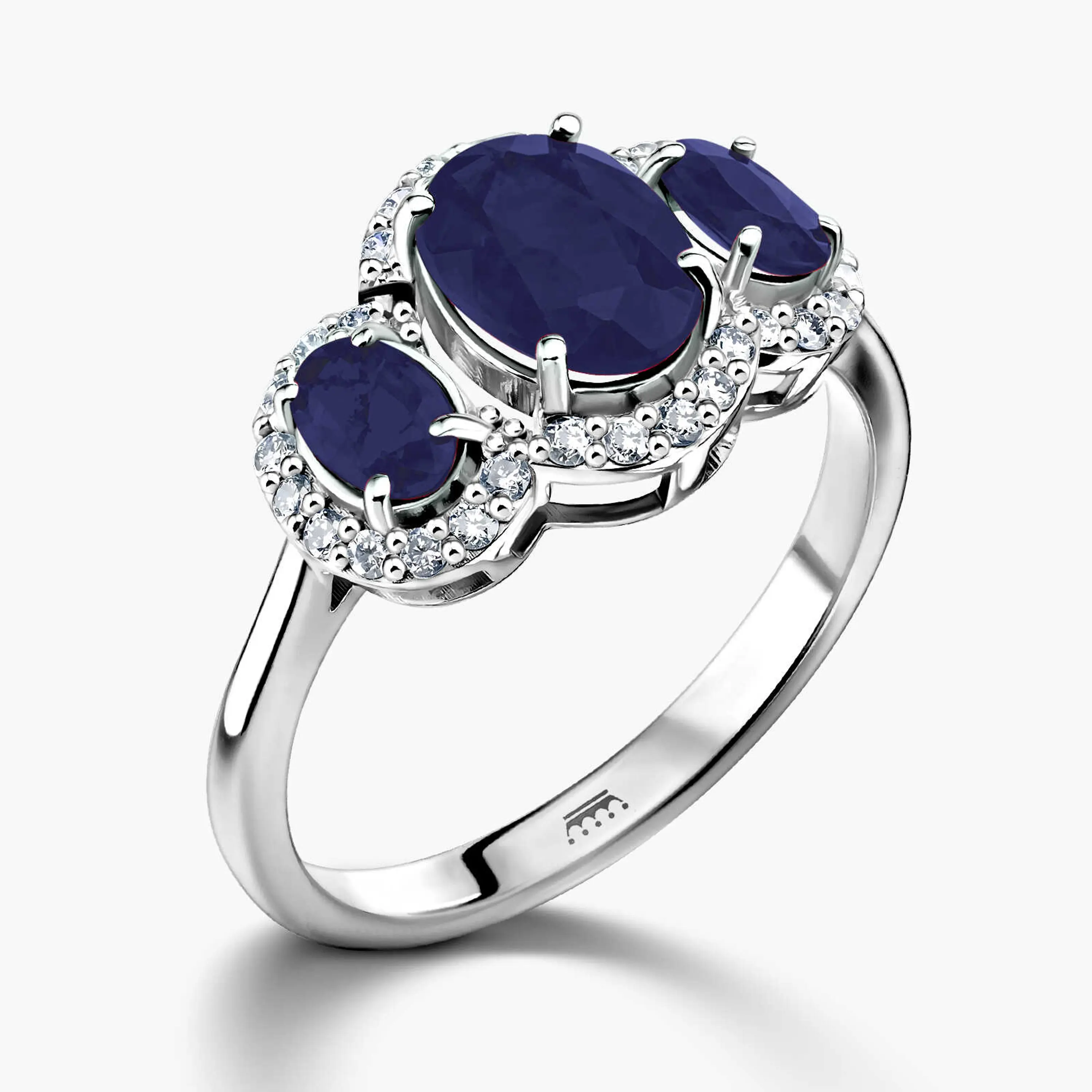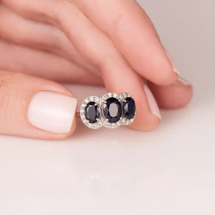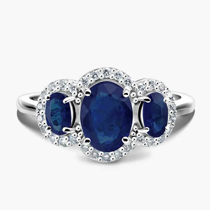 טבעת זהב בלו מסדרת Beauty of nature 14K משובצת ב 3 אבני ספיר כחולות מוקפות 26 יהלומים טבעיים ונוצצים. רוחב הטבעת בחלקה העליון מגיע ל 1.1 ס"מ, אורך הטבעת הכולל את שלושת אבני הספיר והיהלומים שסביבן- 1.7 ס"מ.