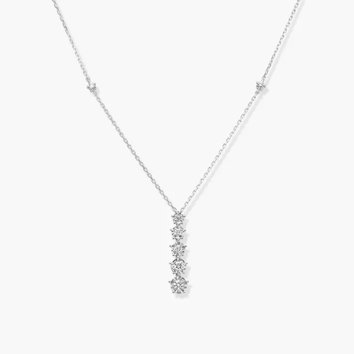 שרשרת זהב לבן 14K ובמרכזה תליון המוכב מ 5 יהלומים התלויים אחד מעל השני וסביבם טבעת זהב בעיבוד לייזר מנצנץ. בשרשרת עצמה משובצים עוד 2 יהלומים ובסה"כ משובצים בשרשרת 7 יהלומים במשקל של כרבע קראט. אורך השרשרת 43 ס"מ, אורך התליון 2.7 ס"מ.