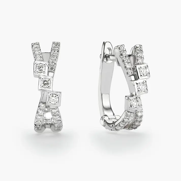 עגילי זהב 14K לבן בצורת X המשובצים 44 יהלומים טבעיים ונוצצים . אורך העגילים 1.4 ס"מ