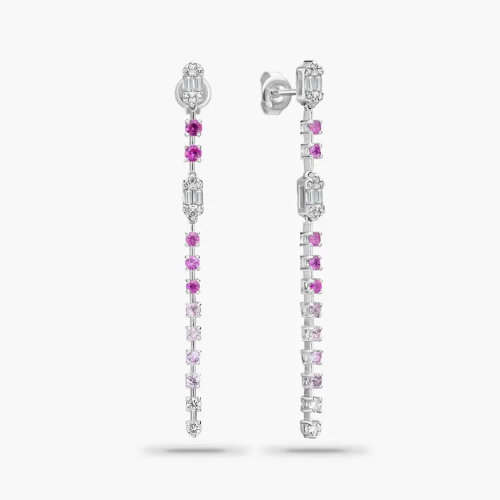 עגילי זהב 14K באורך4.8 ס"מ משובצים ביהלומים טבעיים ונוצצים בחיתוך באגט יוקרתי ובחיתוך עגול ובאבני ספיר ורודות בגוונים שונים.