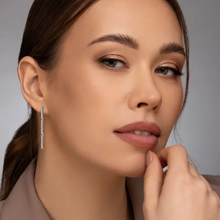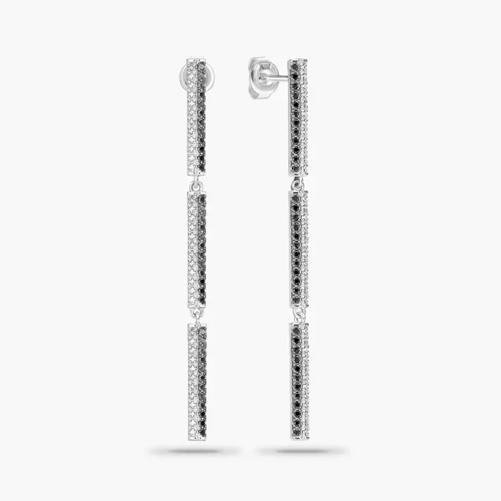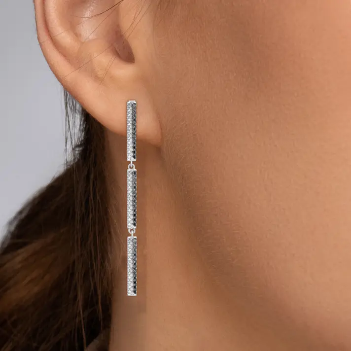 עגילי זהב 14K הבנויים מ 3 מלבנים המשובצים ב-144 יהלומים טבעיים ונוצצים כאשר חציים יהלומים לבנים וחציים יהלומים שחורים. אורך העגילים 5.2 ס"מ.