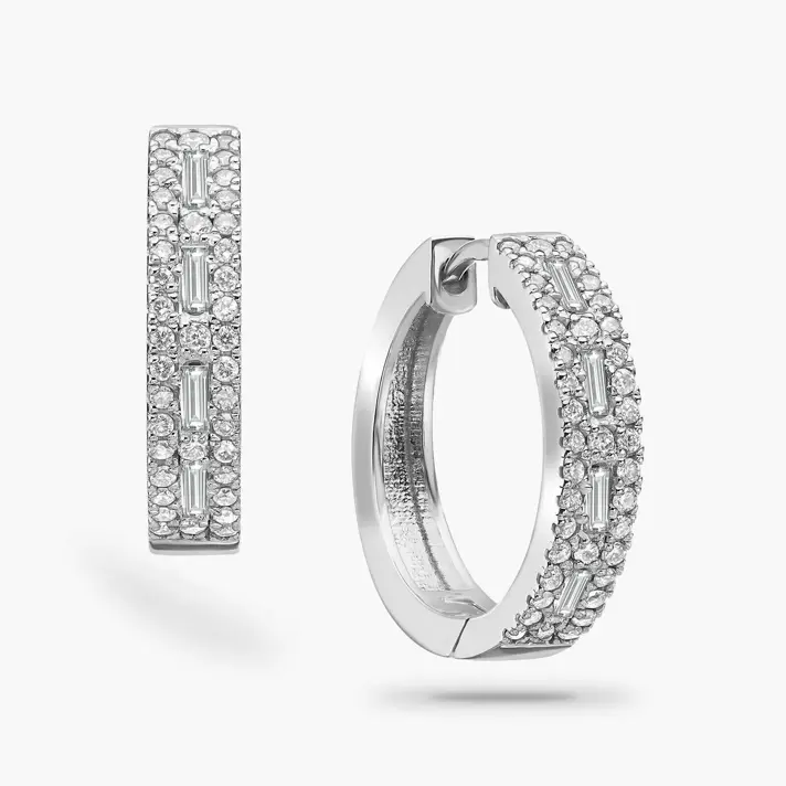 עגילי חישוק בזהב לבן משובצים יהלומי באגט