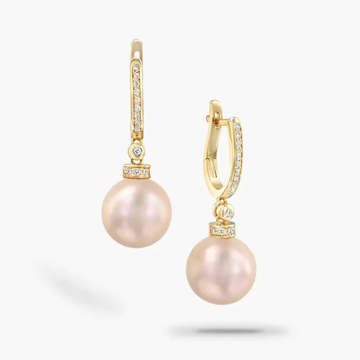 עגילי זהב 14K משובצים פנינים ורודות ו 20 יהלומים טבעיים ונוצצים. אורך העגילים 3 ס"מ.אורך הסוגר משובץ ביהלומים 1.3 ס"מ