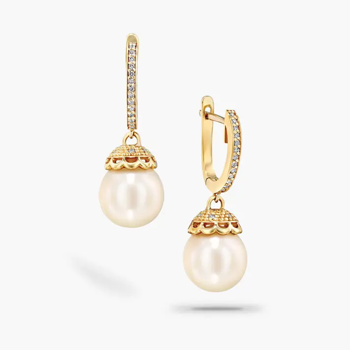 עגילי זהב 14K משובצים בפנינים ורודות מתורבתות וב 36 יהלומים טבעיים ונוצצים. אורך העגיל 2.7 ס"מ
