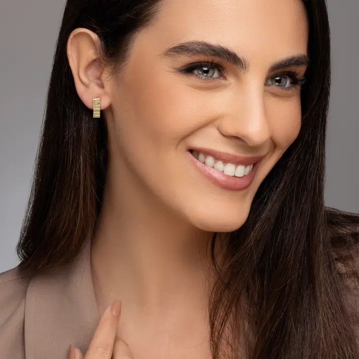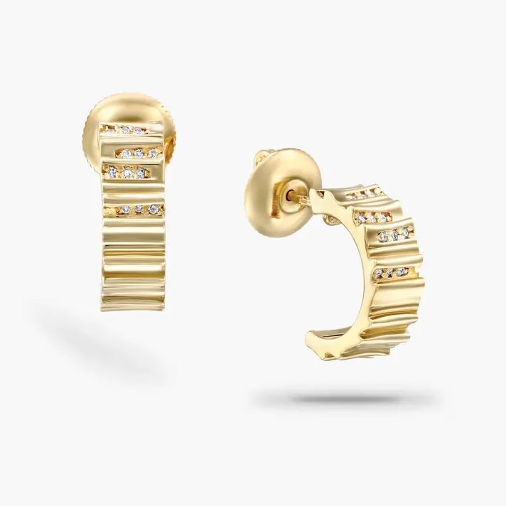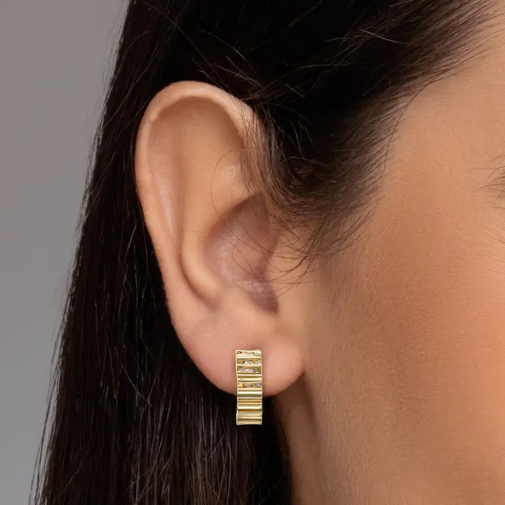 עגילי זהב 14K צמודים המעוצבים כחצי עיגול בזהב מרוקע ומשובצים יהלומים. גובה העגיל 1.3 ס"מ, עובי - 0.45 ס"מ