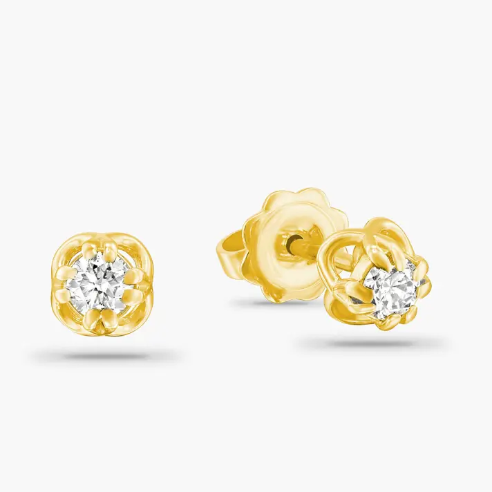 עגילי זהב 14K משובצים ביהלומים נוצצים וטבעיים. לפירוט נתוני היהלומים ניתן ללחוץ על כפתור נתוני אבני החן. קוטר ראש העגילים 2.7 מ"מ.