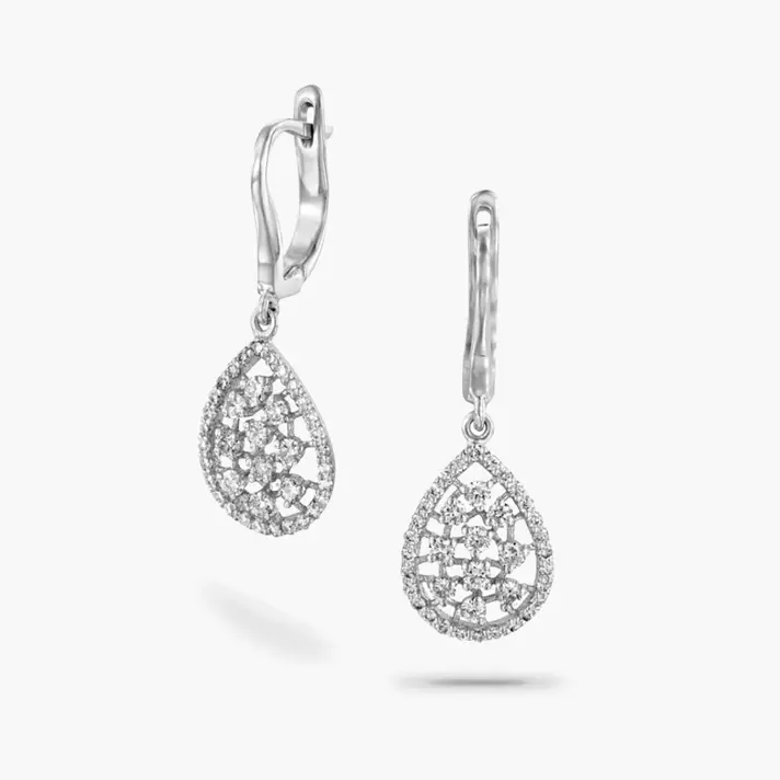עגילי זהב לבן 14K המעוצבים כטיפה מוקפת יהלומים ובתוכה פזורים יהלומים נוספים. סה"כ משובצים בעגיליים 76 יהלומים ( 0.69 קראט) בנקיון SI ובצבע H. כל היהלומים בגימור מושלם של 57 משטחי ליטוש המבטיחים נצנוץ מקסימלי לאורך זמן. לעגילים טבעת ותליון תואמים. אורך העגילים 2.6 ס"מ