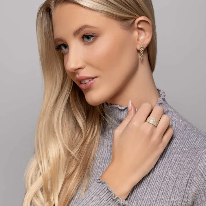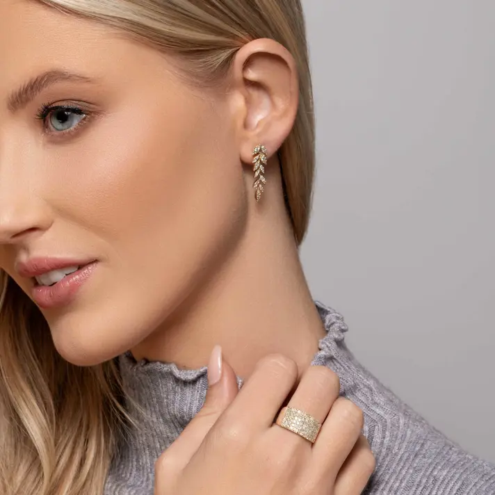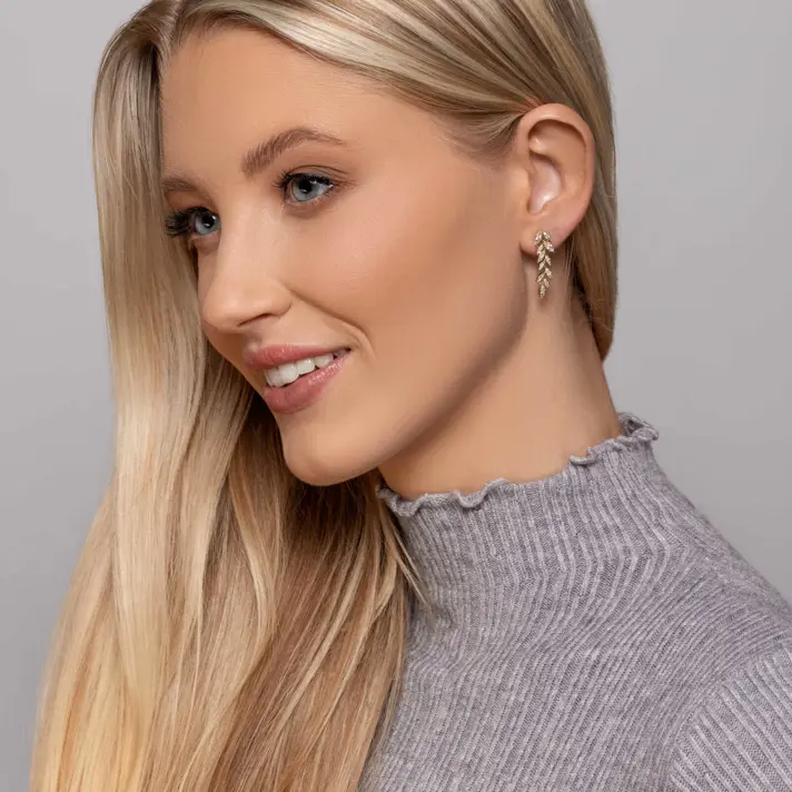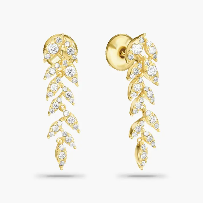 עגילי זהב 14K המעוצבים כעלים המשובצים 66 יהלומים טבעיים ונוצצים במשקל של מעל לחצי קראט. אורך העגילים 2.7 ס"מ.