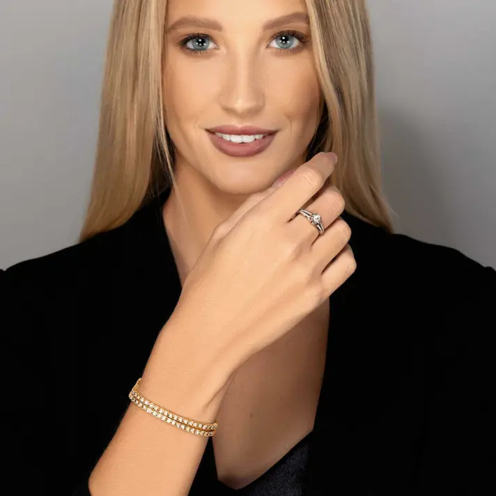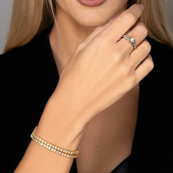צמיד זהב 14K בסגנון טניס הבנוי משני צמידי יהלומים צמודים , משובץ 114 יהלומים טבעיים ונוצצים במשקל 2.5 קראט. רוחב הצמיד 19 ס"מ, רוחבו 6.5 מ"מ, גובה - 2 מ"מ