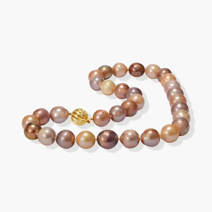 מחרוזת פנינים צבעוניות ופראיות שגדלו במים מתוקים. קוטר הפנינים 15 מ"מ אורך המחרוזת 45 ס"מ. למחרוזת סוגר זהב 14K.