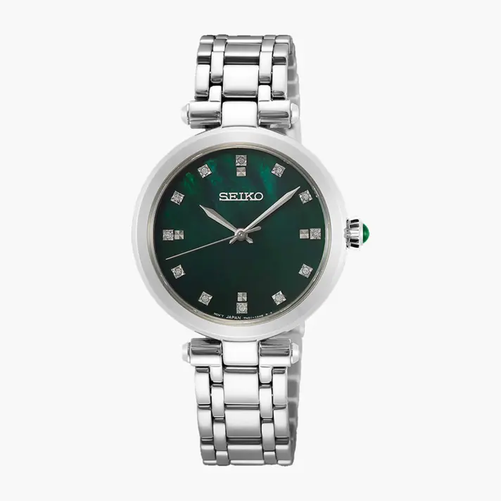 שעון SEIKO לנשים בעל לוח אם הפנינה ירוק משובץ ביהלומים במיקומי הספרות. לשעון צמיד מתכת איכותי, זכוכית ספיר קריסטל ועמידות למים ל 50 מטר. קוטר השעון 30 מ"מ , עוביו 6.3 מ"מ ומשקלו 59 גרם.
