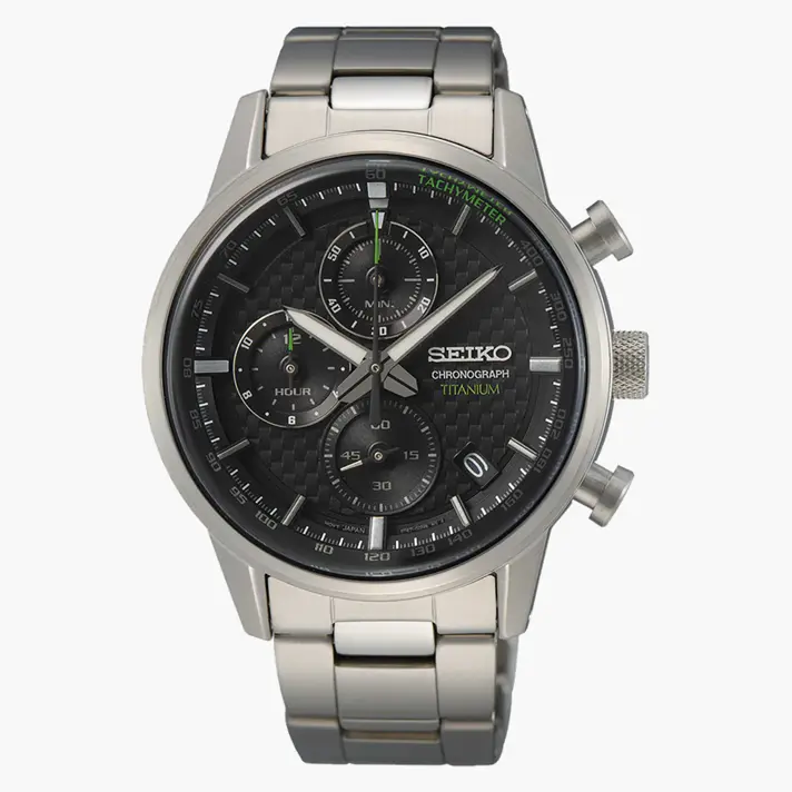 SEIKO CHRONOGRAPH TITANIUM ספורטיבי לגברים בעל לוח משובץ דמוי קרבון ושעון עצר בעל 3 תצוגות נפרדות ( שעות דקות ושניות ). השעון והצמיד עשויים מטיטניום קל ואנטי אלרגני,בלוח זרחני לוממבריט לקריאת השעה גם בחשיכה. לצמיד סוגר הנסגר/נפתח בלחיצת כפתור. זכוכית הרדלקס קריסטל קמורה. לשעון מנגנון קוורץ הפועל ע"י סוללה, השעון עמיד נגד מים עד ל100 מטר, וקוטרו 41 מ"מ.