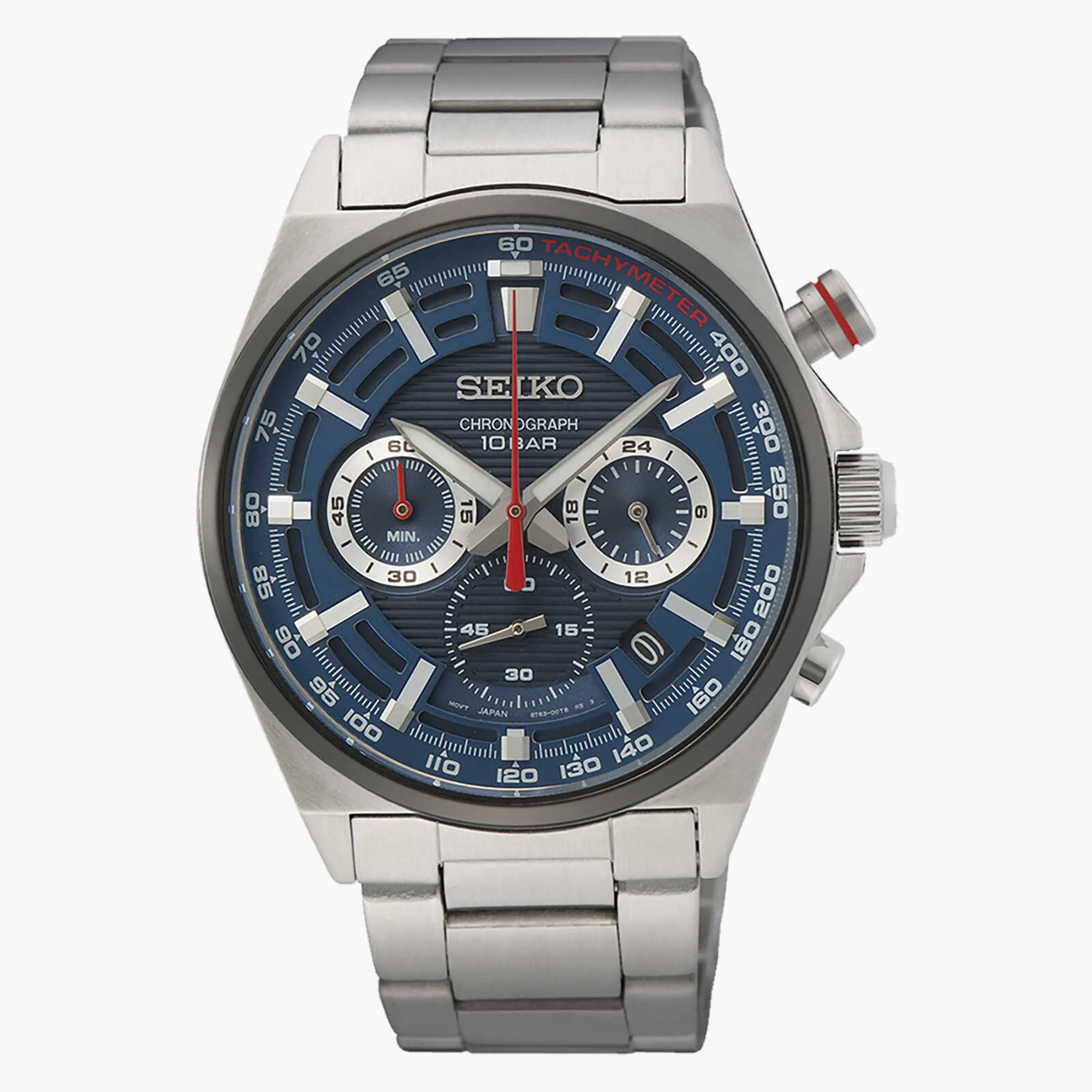 שעון SEIKO לגבר עם לוח כרונוגרף הכולל סטופר, שעון 24 שעות ותאריכון. לשעון מנגנון קוורץ וזכוכית HARDLEX למניעת שריטות, הצמיד ומארז השעון עשוים פלדת אל חלד. קוטר השעון 41 מ"מ, משקלו 152 גרם והוא עמיד למים ל 100 מטר עומק.