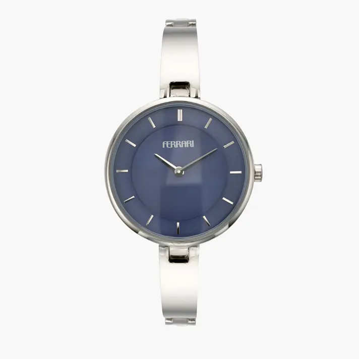 שעון FERRARI בהשראות איטלקיות בעל לוח בצבע כחול כהה וצמיד מתכת איכותי .