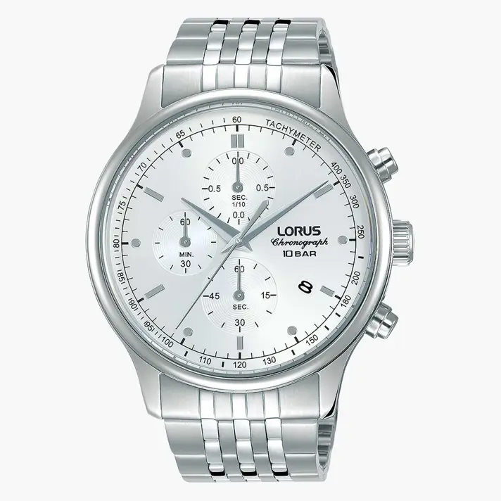 שעון LORUS מבית SEIKO יפן הכולל לוח כסוף ובו תצוגת שעה ותאריך ושלושה שעוני כרונוגרף קטנים. לשעון עמידות למים עד לעומק של 100 מטר וצמיד מתכת איכותית. קוטר השעון 43 מ"מ.