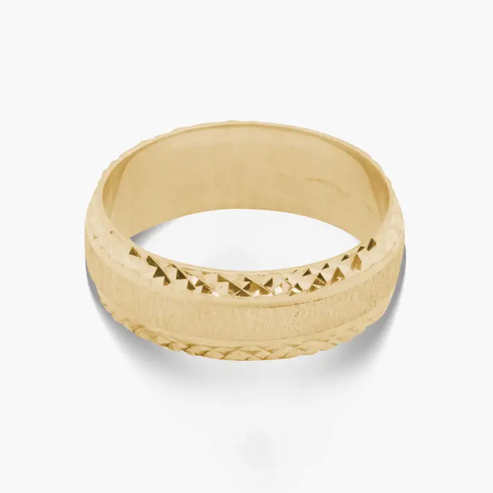 טבעת נישואין בזהב 14K יפה וחגיגית! בעלת מרקם מחוספס בחלקה האמצעי. ניתן להשיג גם בצבעי זהב לבן או אדום.