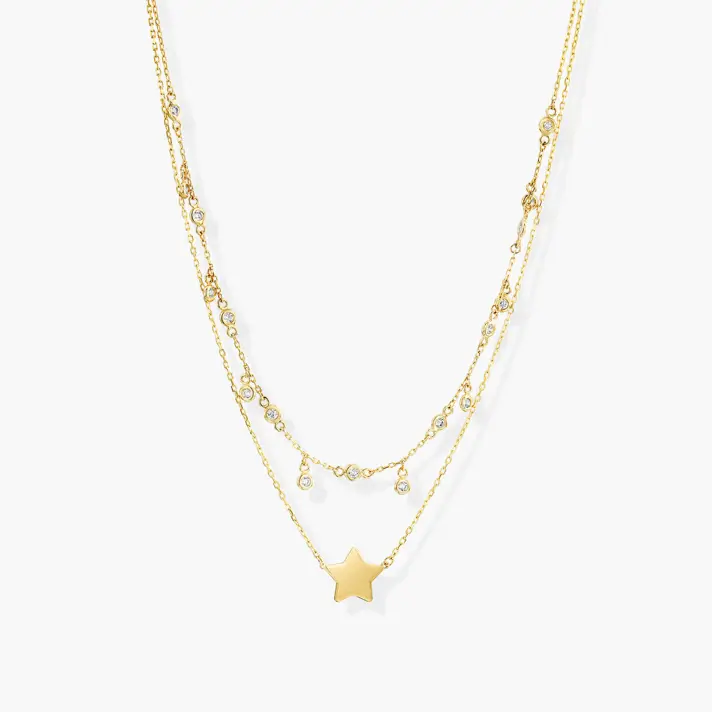 שרשרת זהב 14K הבנויה משתי שרשראות - אחת פנימית משובצת בזירקונים נוצצים ואחת ארוכה יותר עליה תלוי כוכב זהב . אורך השרשרת משובצת בזירקונים 32 ס"מ, אורך השרשרת עם הכוכב 33.5 ס"מ + 6 ס"מ תוספת להארכת שרשראות.