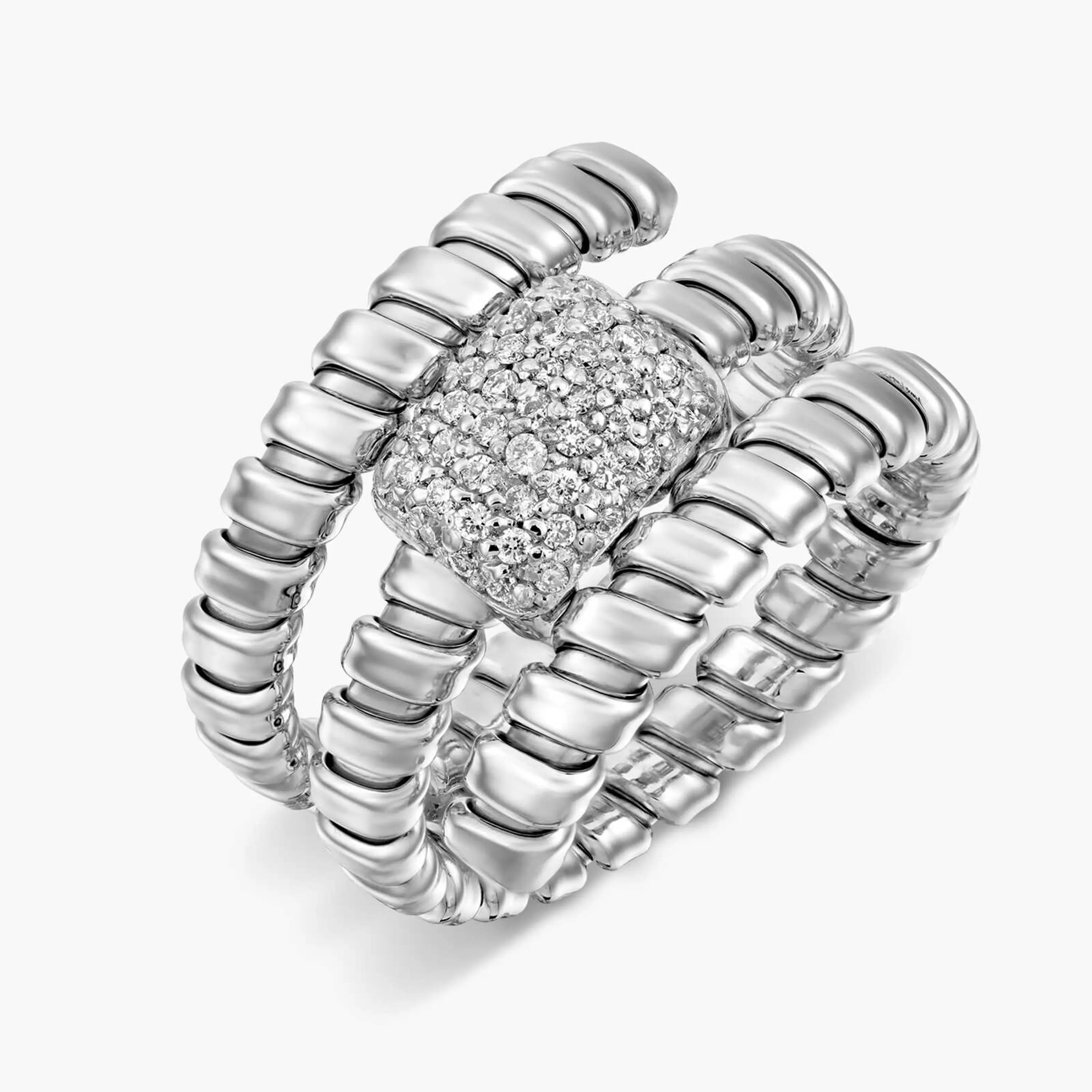טבעת זהב לבן 14K המעוצבת כנחש מוזהב המתפתל סביב האצבע ובראשו משטח של 47 יהלומים טבעיים (0.24 קראט) בגימור של 57 משטחים, המבטיח נצנוץ מושלם מכל יהלום. נקיון היהלומים SI והצבע H . רוחב הטבעת 1.35 ס"מ
