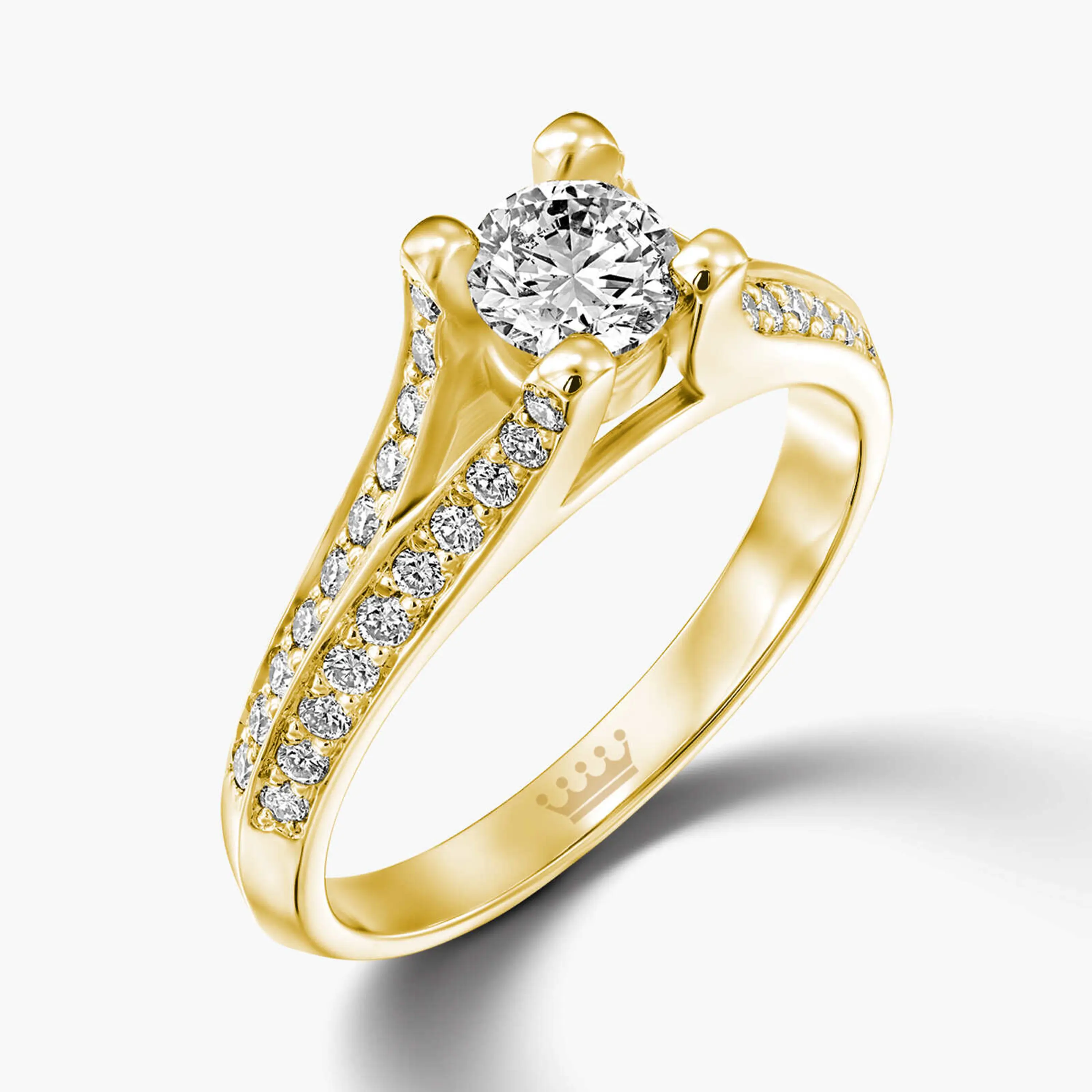 טבעת סוליטר בזהב צהוב 14K משובצת אבן מרכזית ומשני צדדיה זרועות המשובצות 40 יהלומים