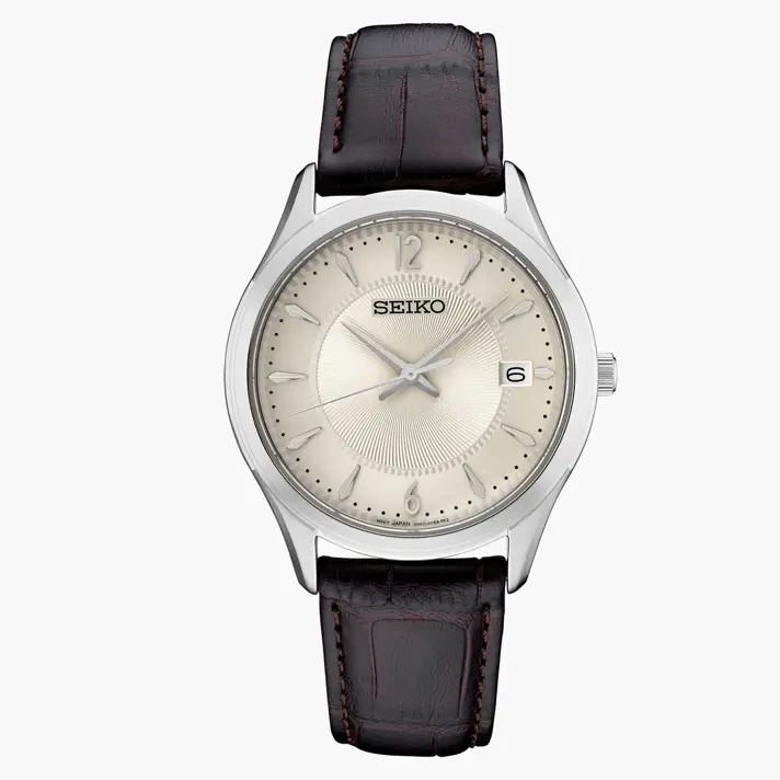 שעון SEIKO אלגנטי לגברים בעל לוח עשיר המשלב טקסטורות שונות ,השעון עשוי פלדת אל חלד ומעובד בגימורי מט ומבריק על משטחי השעון,רצועת השעון מעוטרת בתפרים בצידה ועשויה מעור איכותי. לשעון זכוכית ספיר קריסטל למניעת שריטות והוא נגד מים עד לעומק 100 מטר. בתוך השעון פועם מנגנון קוורץ איכותי המופעל ע"י סוללה . קוטר:40 מ"מ עובי: 8.2 מ"מ