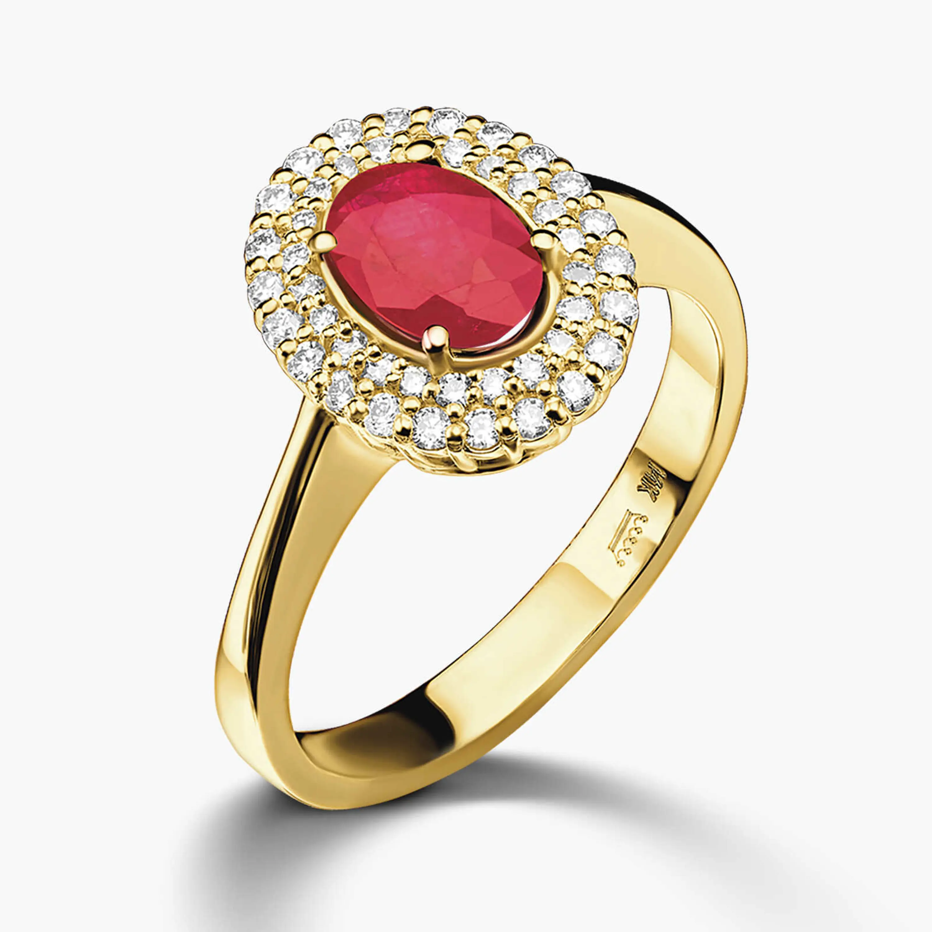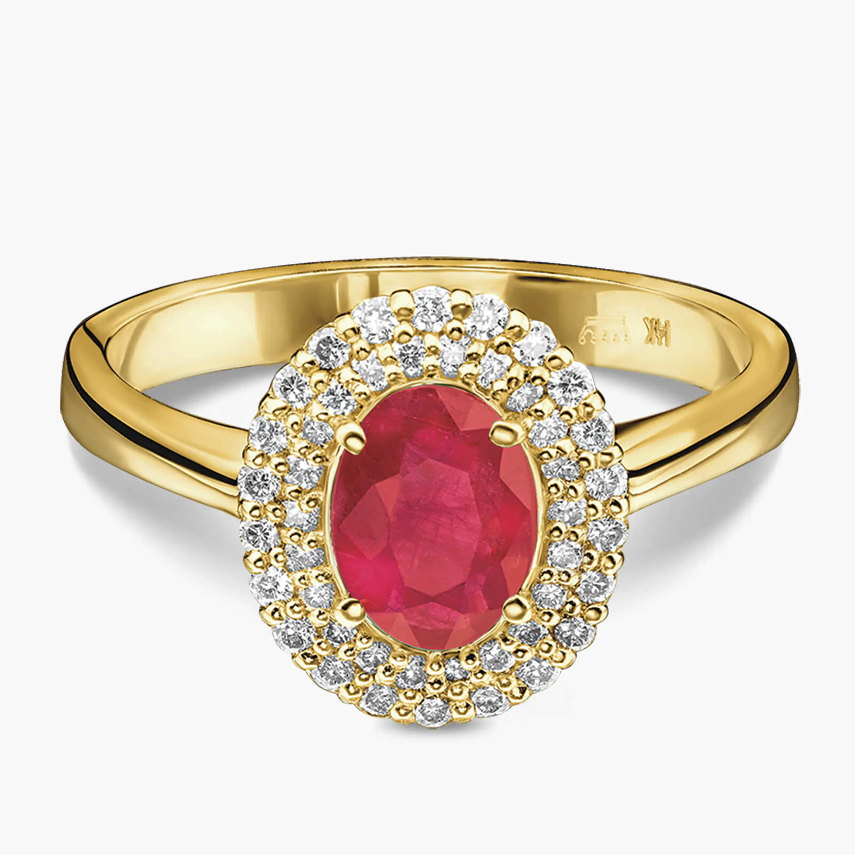 טבעת זהב 14K עם ראש אובאלי משובצת באבן רובי אדומה מוקפת בשני מעגלים של 44 יהלומים טבעיים ונוצצים. רוחב ראש הטבעת 1 ס"מ ואורכה 1.2 ס"מ