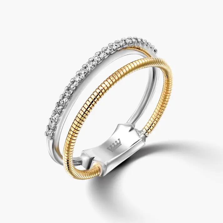 טבעת זהב 14K המורכבת משתי טבעות - אחת בזהב צהוב בגימור סליל זהב ואחת בזהב לבן משובצת 21 יהלומים טבעיים ונוצצים.