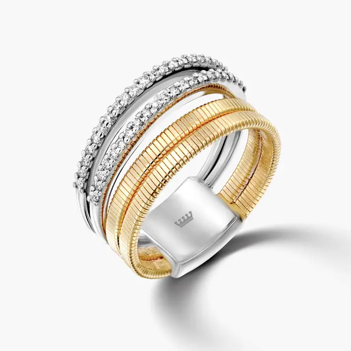 טבעת זהב 14 קראט הבנויה מ  טבעות, כאשר 2 מהם בגימור חוליות ושתי האחרות משובצת 42 יהלומים טבעיים ונוצצים. רוחב הטבעת 0.9 ס"מ