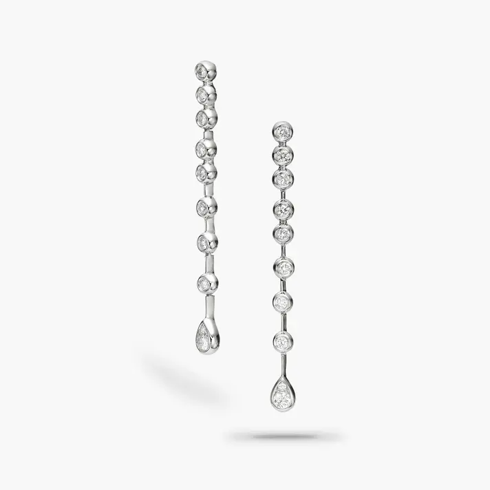 עגילי זהב 14K משובצים לאורכם ב 20 יהלומים טבעיים ונוצצים . אורך העגילים 4 ס"מ.