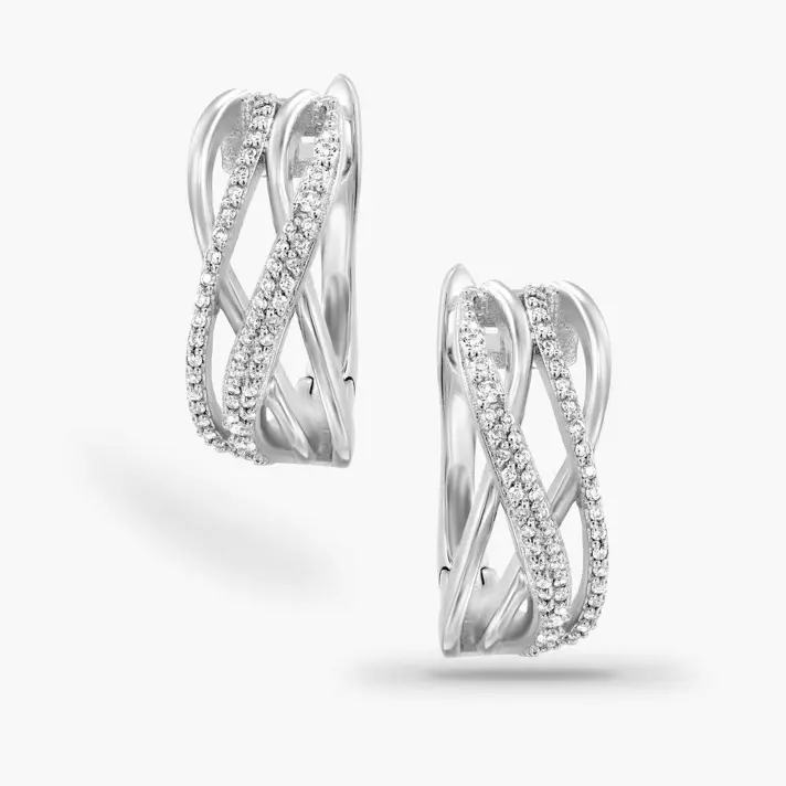 עגילי זהב 14K המעוצבים כגלים ומשובצים 108 יהלומים טבעיים ונוצצים במשקל 0.24 קראט. אורך העגיל 1.8 ס"מ, רוחבו 0.7 ס"מ