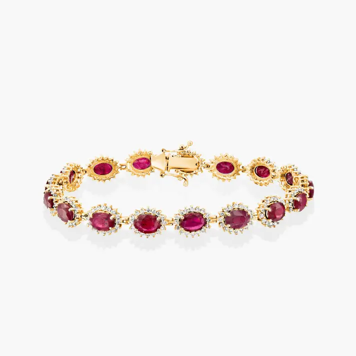 צמיד זהב 14K מהמם ביופיו המשובץ ב 17 אבני רובי אדומות המוקפות ב 272 יהלומים נוצצים וטבעיים.