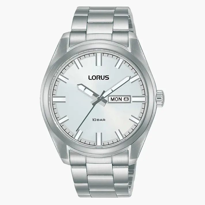 שעון LORUS מבית SEIKO יפן בעל לוח כסוף המציג שעה ותאריכון הכולל את היום בשבוע. לשעון צמיד מתכת איכותי והוא עמיד למים עד לעומק 100 מטר. קוטר השעון 40 מ"מ.