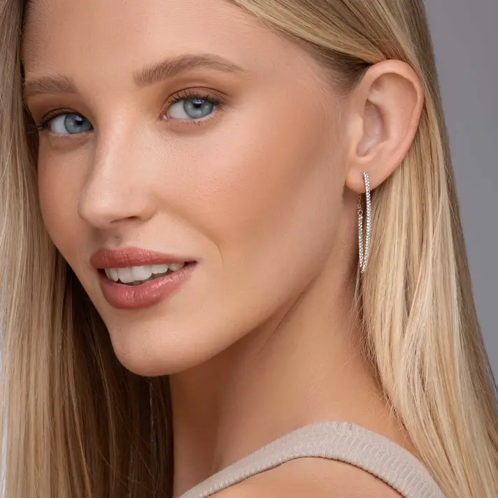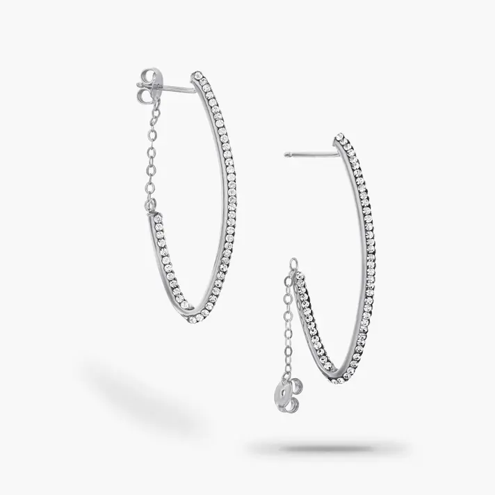 עגילי זהב לבן מאורכים משובצים זירקונים עם סוגר שרשרת באורך 4 ס"מ