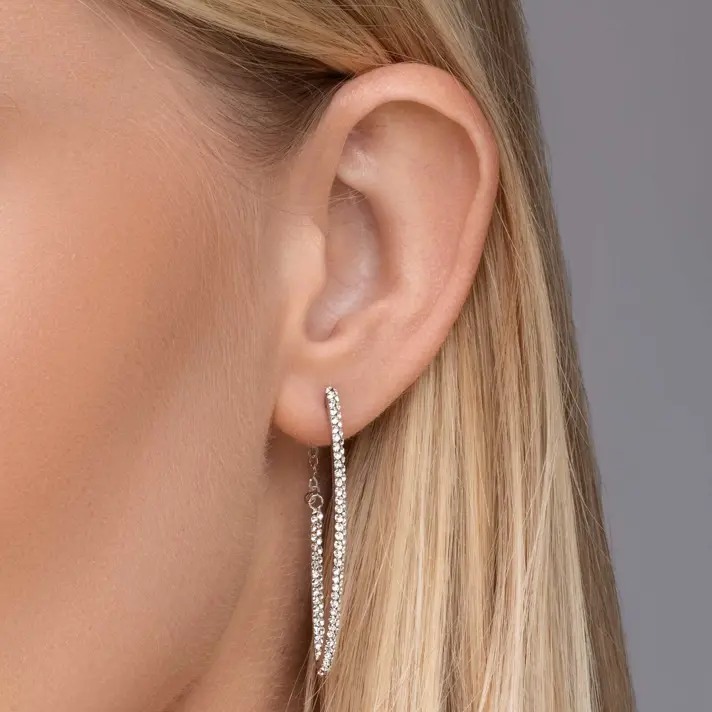 עגילי זהב 14K בצורת חישוק מאורך משובץ בזירקונים נוצצים ופתוח בצידו האחרי. סוגר העגילים מחובר בשרשרת כך שלא יוכל ללכת לאיבוד. אורך העגילים 4 ס"מ.