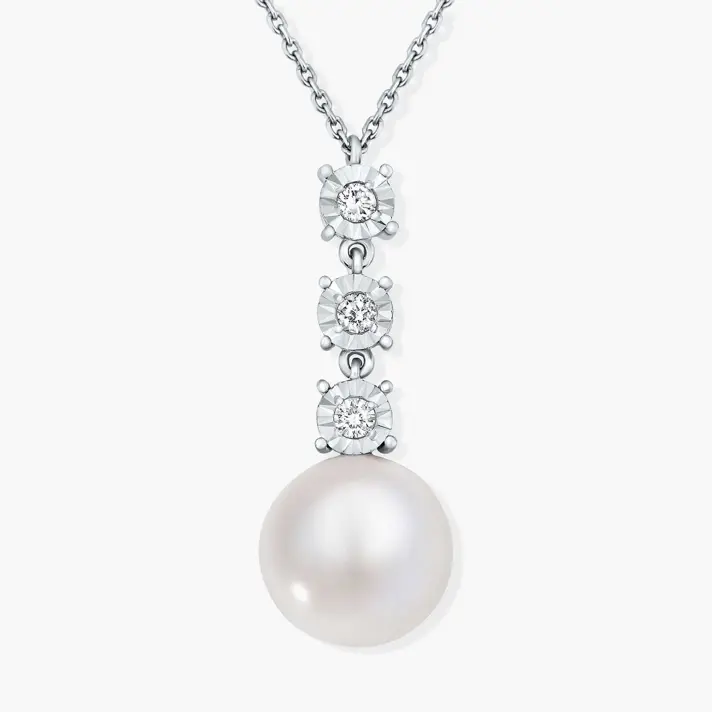 תליון זהב 14K המשובץ בפנינה טבעית שגדלה במים מתוקים בקוטר 10 מ"מ וב- 3 יהלומים טבעיים ונוצצים מוקפים בטבעת זהב בעיבוד לייזר המגבירה את הנצנוץ של כל יהלום. אורך התליון 2.5 ס"מ ומצורפת אליו שרשרת זהב 14K באורך 42 ס"מ והיא כלולה במחיר.