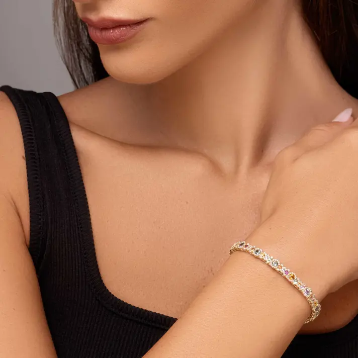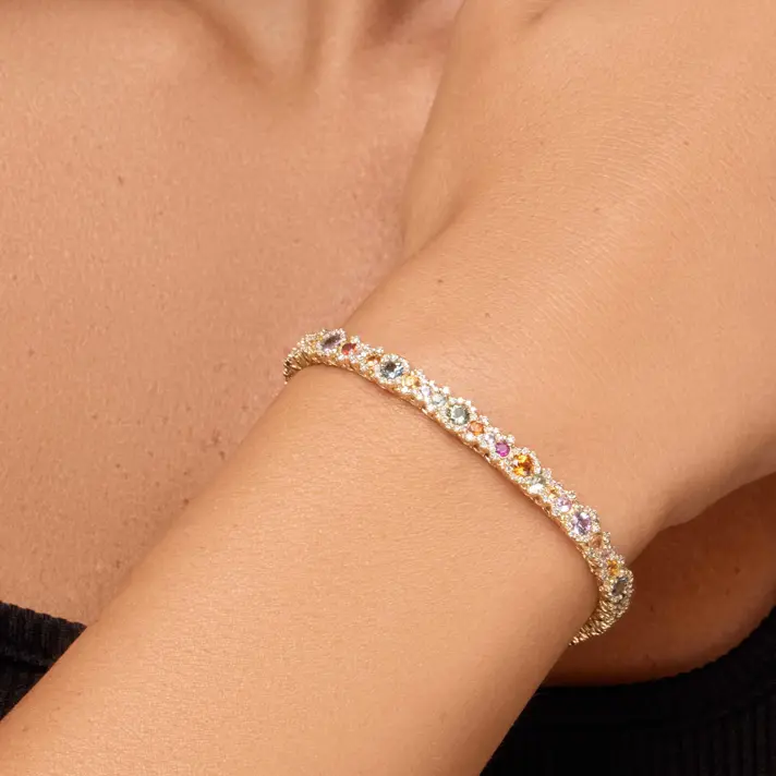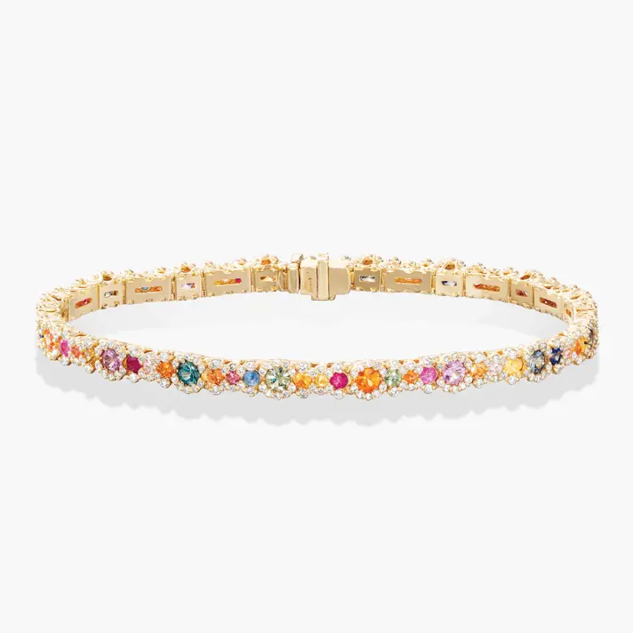 צמיד RAINBOW עשוי זהב צהוב 14K ובשיבוץ ספירים צבעוניים ו- 321 יהלומים טבעיים ונוצצים. יש יותר נוצץ מזה?