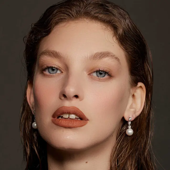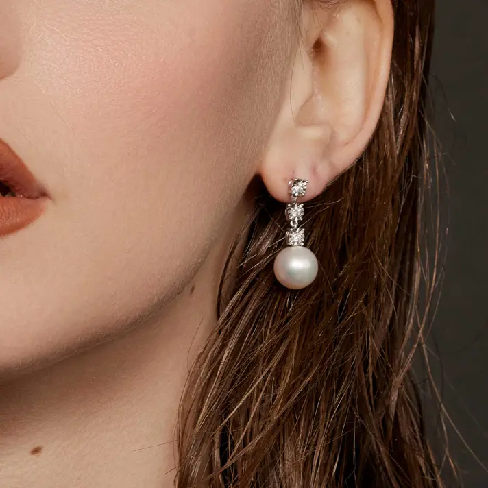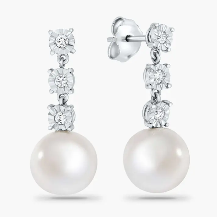 עגילי זהב 14K תלויים המשובצים ב 6 יהלומים טבעיים ונוצצים במשקל 0.24 קראט וב 2 פנינים טבעיות שגודלו במים מתוקים בקוטר 10 מ"מ. אורך העגילים 2.5 ס"מ.