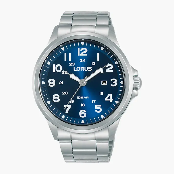 שעון LORUS מבית SEIKO יפן. לוח השעון כחול וסימוני הספרות ומחוגי השניות בצבע לבן. השעון עמיד למים לעומק 100 מטר ויש לו רצועת מתכת איכותית. קוטר השעון 44 מ"מ.