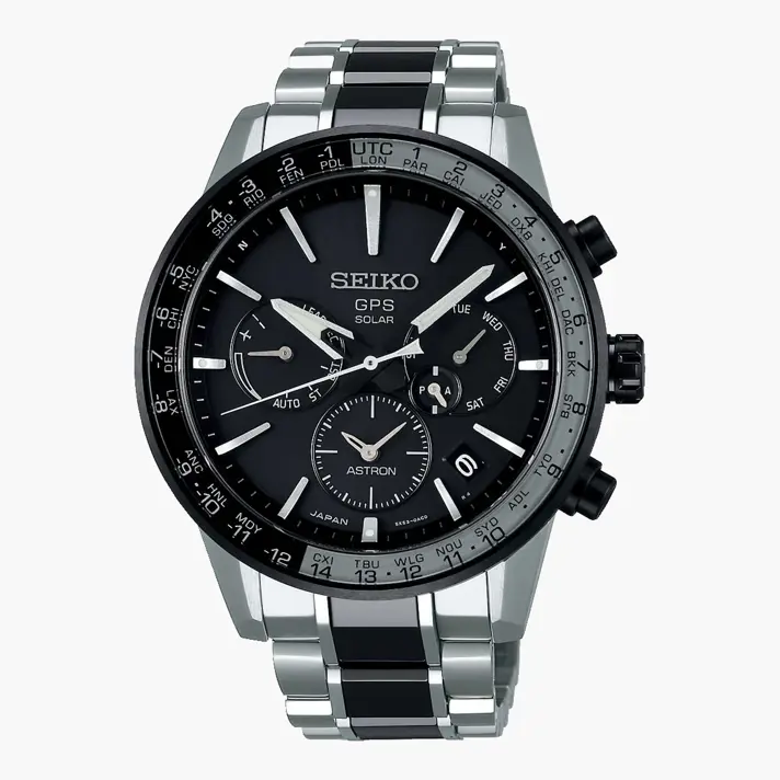שעון SEIKO מסדרת ASTRON עם מנגון 5X חדש בעל רכיב GPS המאפשר לשעון לדעת את השעה בכל מקום בעולם על חיבור ללוויני ה GPS. השעון מסתנכרן לבד לשעה ולתאריך הנכונים במקום בו הוא נמצא וניתן בלחיצת כפתור אחת לבצע סנכרון ידני. בחלקו התחתון של לוח השעון ממוקם שעון נוסף המציג את השעה באיזור זמן נוסף, מה שמאפשר תמיד לראות את הזמן בבית גם כשנמצאים בחו"ל והשעון הגדול מראה את השעה המקומית. לשעון מנגנון סולארי המייצר את האנרגיה לה הוא זקוק מקרני האור ואין צורך בהחלפת סוללה.לשעון באזל קרמי שחור אפור,צמיד וקופסת שעון העשויים מטיטניום קל משקל וסימוני ספרות ומחוגים הזוהרים בחושך.לשעון זכוכית ספיר קריסטל והוא עמיד במים עד לעומק 100 מטר. עובי השעון 13.3 מ"מ וקוטרו 43.5 מ"מ.